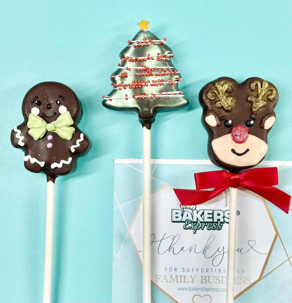 Transform your frozen red velvet cake into festive Christmas cakepops using our exclusive plunger collection. Roll the thawed cake into your desired shapes—Christmas trees, wrapped gifts, and stockings—then dip in chocolate coating for a polished finish. These holiday-themed treats combine elegant presentation with rich red velvet flavor, making them perfect for seasonal gatherings, gift boxes, or bakery displays. Each plunger creates consistent, professional-looking shapes that impress customers and elevate your dessert offerings during the festive season.